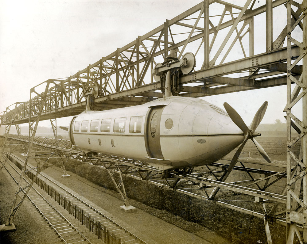 Bennie Railplane es un híbrido entre un tren y un avión. Concretamente, más bien deberíamos decir que es un híbrido entre monorriel en suspensión y un avión de hélice. Fue construido en la década de los 20 y se estima que podía moverse a una velocidad de 190 km/h. Su creador entró en quiebra por falta de financiación y nunca más vimos el prototipo.