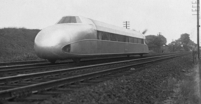El Rail Zeppelin, con capacidad para 40 personas, fue diseñado por un ingeniero aeronáutico alemán en 1929. Como podemos prever, su medio de propulsión era mediante una hélice situada en la parte trasera. Consiguió alcanzar velocidades de 230,2 km/h, batiendo el récord de velocidad terrestre de ‘railcars‘.