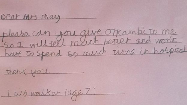 "Por favor, señora May, ¿puede darme Orkambi para sentirme mejor y no tener que pasar tanto tiempo en el hospital?", escribió el niño.