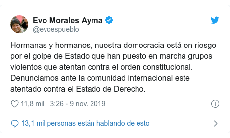 "Nuestra democracia está en riesgo por el golpe de Estado que han puesto en marcha grupos violentos que atentan contra el orden constitucional", escribió el mandatario en Twitter.