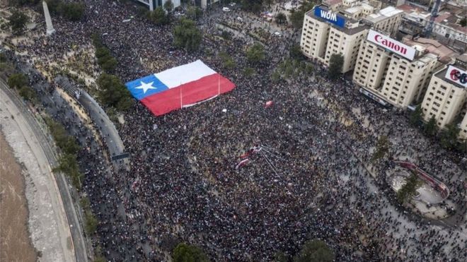 La protesta más grande se dio en Santiago de Chile, donde unas 75.000 personas -según la cifra oficial- se congregaron en la ya icónica Plaza Italia para refrendar sus exigencias de reformas al gobierno y la renuncia del presidente Sebastián Piñera.