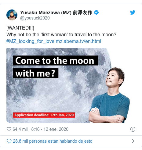 En una convocatoria en línea, Maezawa, magnate de la moda, afirma que quiere compartir la experiencia con una mujer "especial".