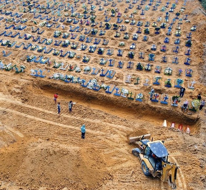 Precipitado por la crisis sanitaria, el alcalde Arthur Neto se vio forzado a tomar la decisión de hacer pozos colectivos en el Cementerio Nossa Senhora de Aparecida de la ciudad de Manaos. Allí, los cajones son apilados uno arriba del otro. Desde hace algunos días las excavadoras avanzan en el cementerio abriendo trincheras, mientras que en los hospitales de Manaos funcionarios equipados con trajes blancos, máscaras y guantes trasladan sin pausa los cuerpos sin vida de pacientes infectados de covid-19.