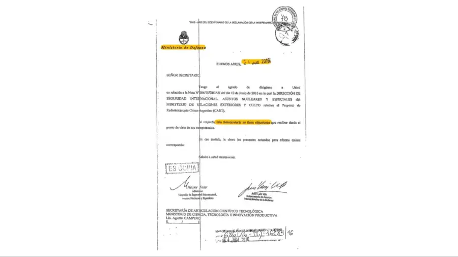Sin embargo, este medio accedió a una opinión consultiva de 2016, cuando el propio Ministerio de Defensa, junto a Cancillería y la CONAE, había evaluado y aprobado el funcionamiento del proyecto científico y público CART, concluyendo que “no existía riesgo alguno para la soberanía nacional”. A diferencia de lo que ocurrió, por ejemplo, con el radar de Ushuaia, de naturaleza privada y comercial, actualmente frenado por una cautelar. Aquella auditoría —avalada en su momento por la entonces Subsecretaría de Asuntos Internacionales para la Defensa— había sido solicitada por Cancillería, en función de los procedimientos administrativos necesarios en torno a sectores estratégicos.